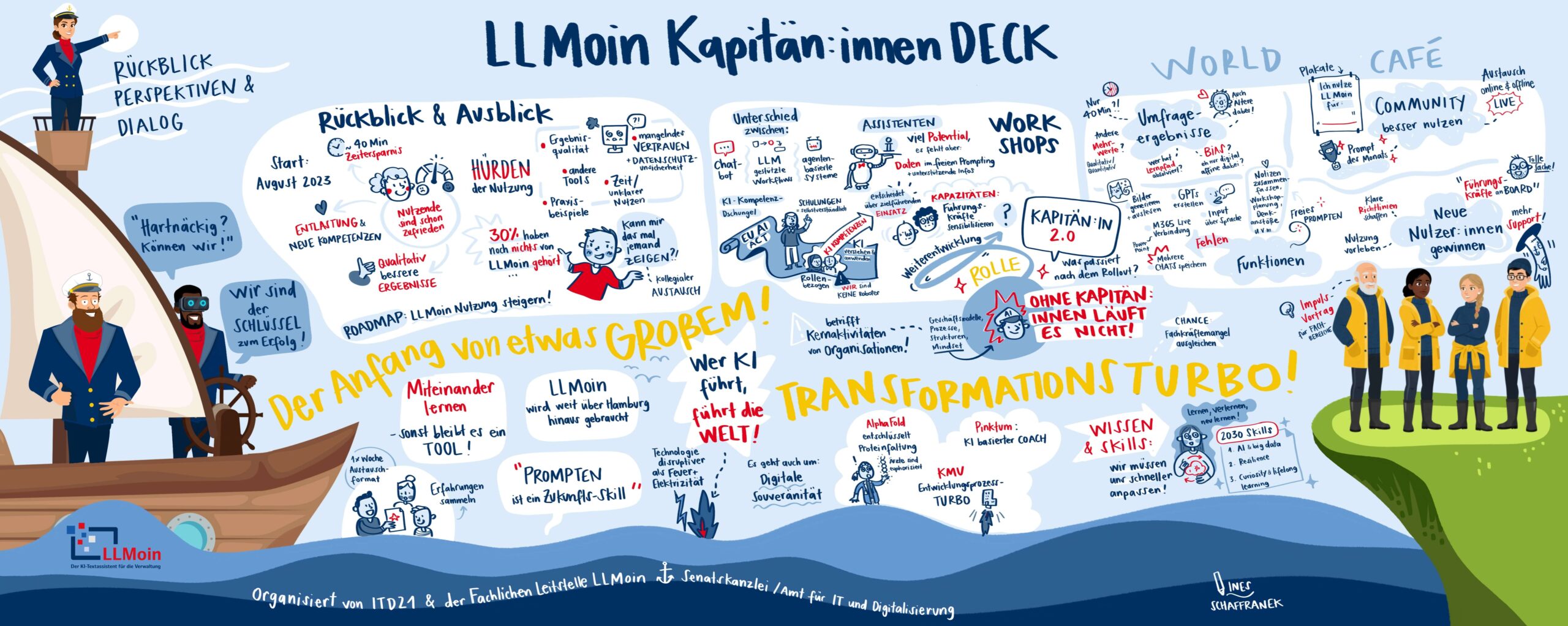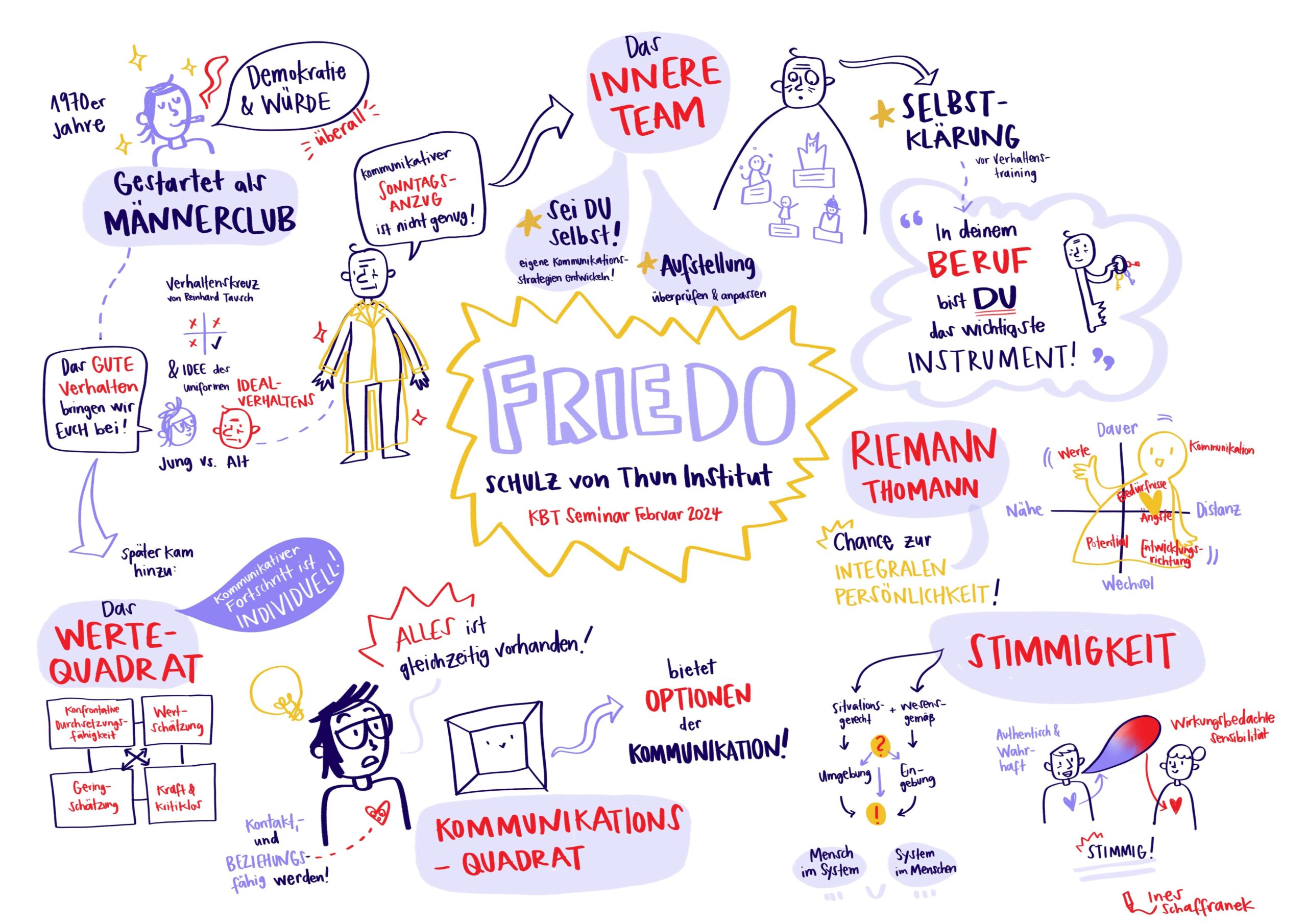 2022 habe ich mich zum Organisationscoach (ORSC) weitergebildet, denn abseits der schönen Dokumentation können Live-Visualisierungen helfen, gruppendynamische Prozesse wirkungsvoll zu begleiten. Mehr zu meiner Arbeit als Facilitator und Organisationsentwicklerin findet ihr auf ines-schaffranek.de